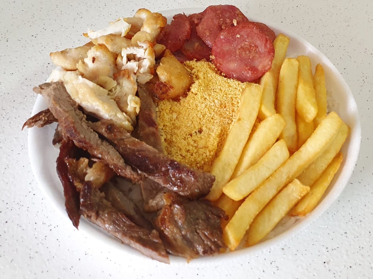 Composta por arroz branco solto, feijão carioca com tempero caseiro, tiras suculentas de bife e filé de frango grelhados, Linguiça Calabresa e batatas fritas crocantes. Acompanhada de uma irresistível farofa da casa, que adiciona uma textura incrível.
